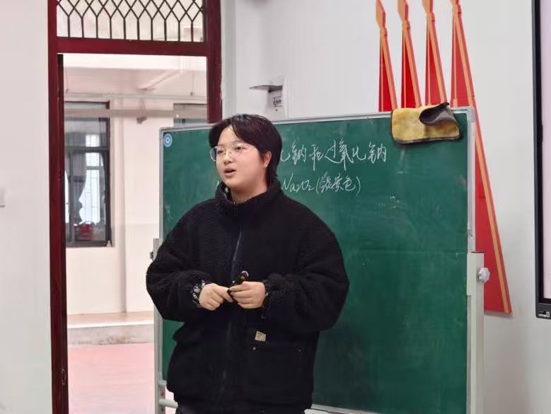 曾雨宏同学在《氧化钠与过氧化钠》一课中,以“深海供氧、火灾防毒面具”的生活场景切入,巧妙引出“氧气搬运工”——钠的两种氧化物,迅速激发学生探究兴趣。课堂节奏张弛有度,注重知识衔接与学生互动参与。在点评环节,获得评委老师的一致好评,付伟伟副院长称赞其授课时落落大方、面向听众,声音表达效果较好,展现了不错的教学仪态与表达基础,因汇报课时间有限,也指出曾雨宏同学在后续的教学中需优化内容取舍,聚焦核心知识点,打磨教学节奏与思维连贯性。