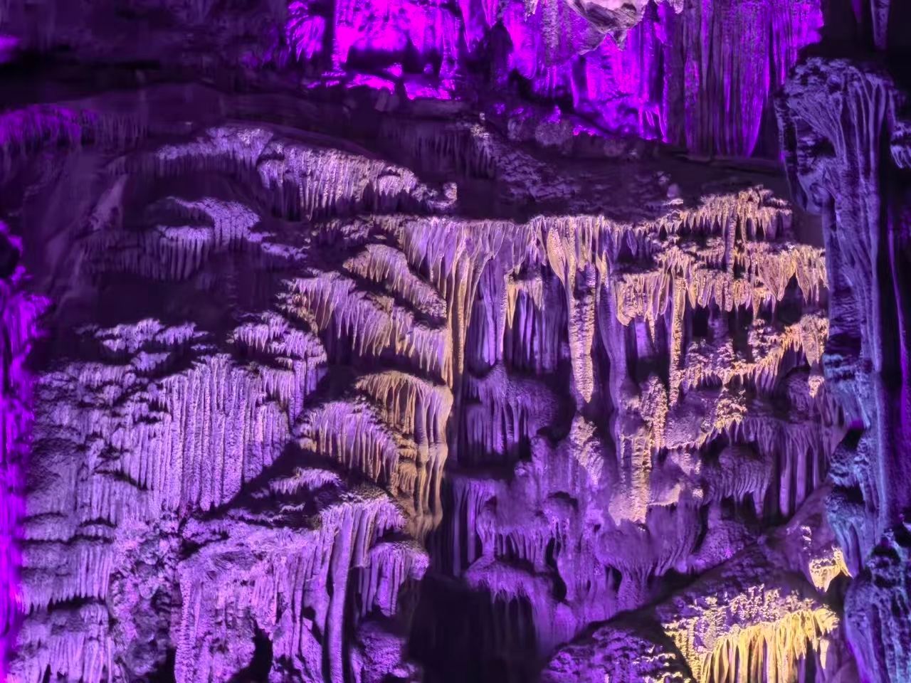 最后,同学们走进芦笛岩,开展地下喀斯特地貌探索与遥感影像认知实践。一方面近距离观察石钟乳、石笋、石柱、石幔等堆积地貌的形态特征与分布规律,结合溶洞内的水文条件,理解地下水的溶蚀、沉积作用在溶洞发育中的核心作用。