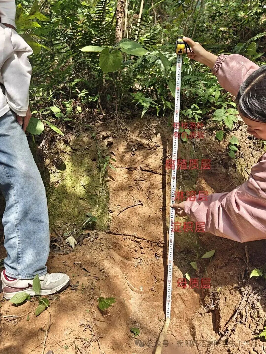 沿良栖山居至祝融峰的路线可以直观地观测到垂直地带性分异规律、土壤类型渐变及植物群落从常绿阔叶林到针阔混交林的过渡。在紫竹林、铁佛寺等点位,同学们重点观察了山地土壤的剖面结构,对比不同海拔土壤的质地、颜色、有机质含量差异,理解地形、气候对土壤发育的影响。
