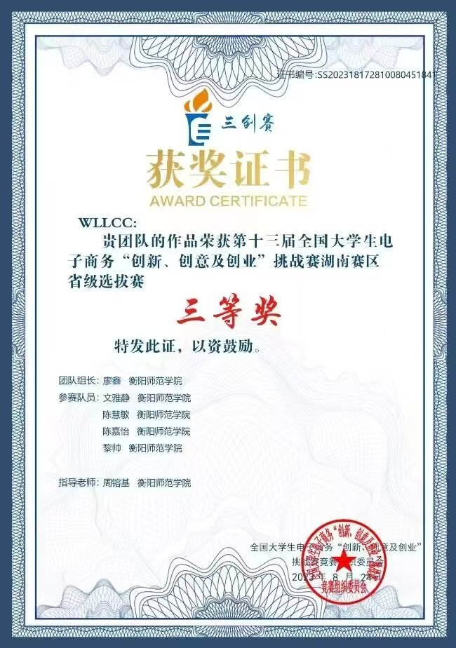 1.2023年荣获第十三届全国大学生电子商务“创新、创意及创业”挑战杯湖南赛区省级选拔赛三等奖