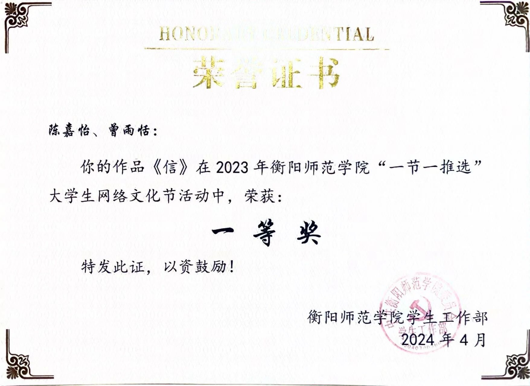 2024年4月作品《信》获“一节一推选”
