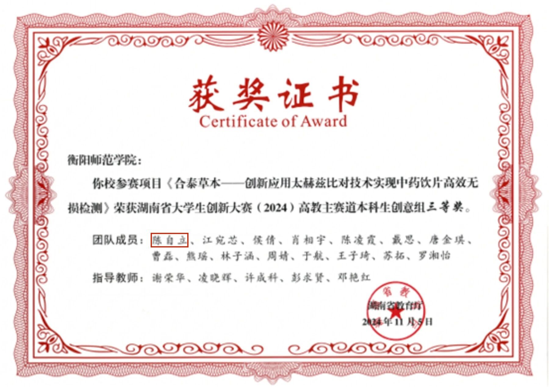 陈自立以笃行之姿、创新之志,在科研与实践的双轨道上勇毅前行。他深耕物理光电领域,以“铋基无铅双钙钛矿”研究斩获省级科研立项,更将太赫兹技术创新性引入中药饮片检测,破解传统检测效率低、误差大的行业痛点,推动中医药现代化进程。赛场之上,他率队揽获“创青春”“挑战杯”等国家级、省级大奖,用跨界协作与精准路演展现青年创客的智慧锋芒。扎根乡村振兴一线,他将实验室的光谱技术转化为田间地头的“检测神器”,通过设备改良、操作简化与数据反哺,让高科技以“低成本、易操作”的方式赋能基层农业,在科技助农与医疗支援中诠释青年担当。其身上彰显的“科研落地的巧劲、创业攻坚的韧性、服务民生的情怀”,不仅是新时代青年“专业精耕”与“心怀家国”的生动写照,更启示我们:当以创新为翼、以实践为基,在“将论文写在祖国大地上”的征程中,让青春在科技强国与乡村振兴的火热实践中绽放璀璨光芒!