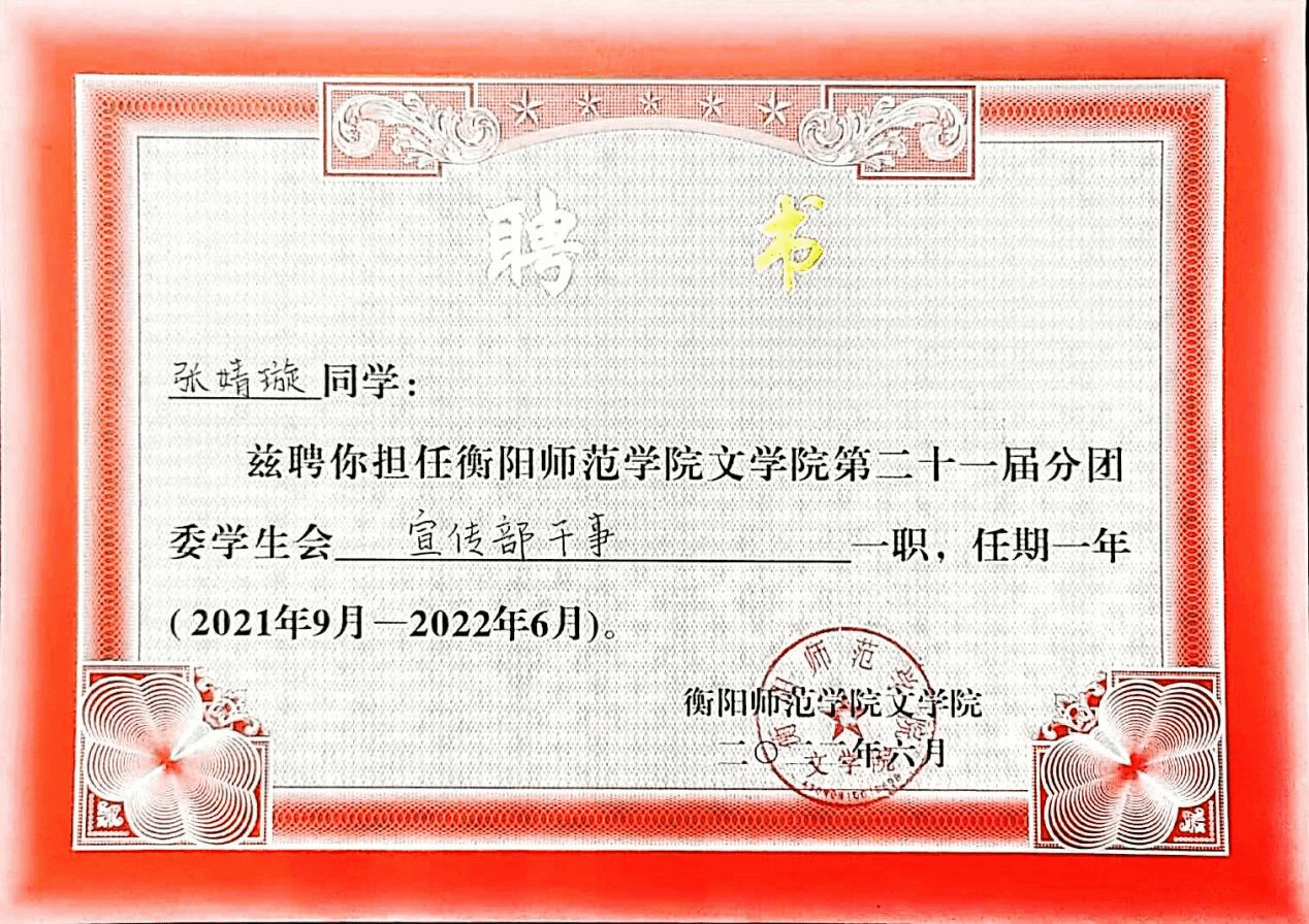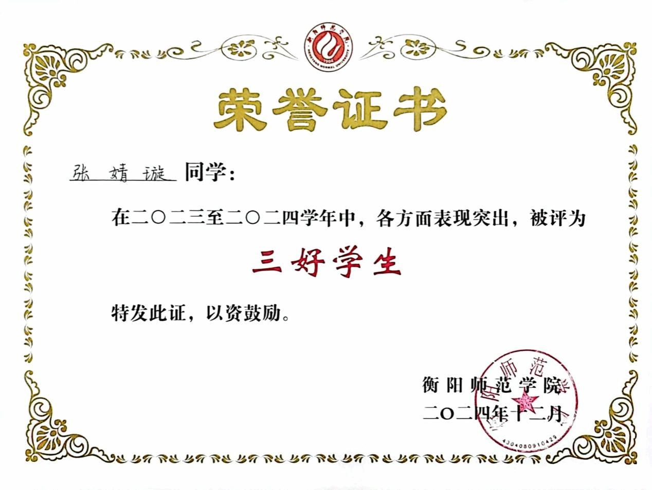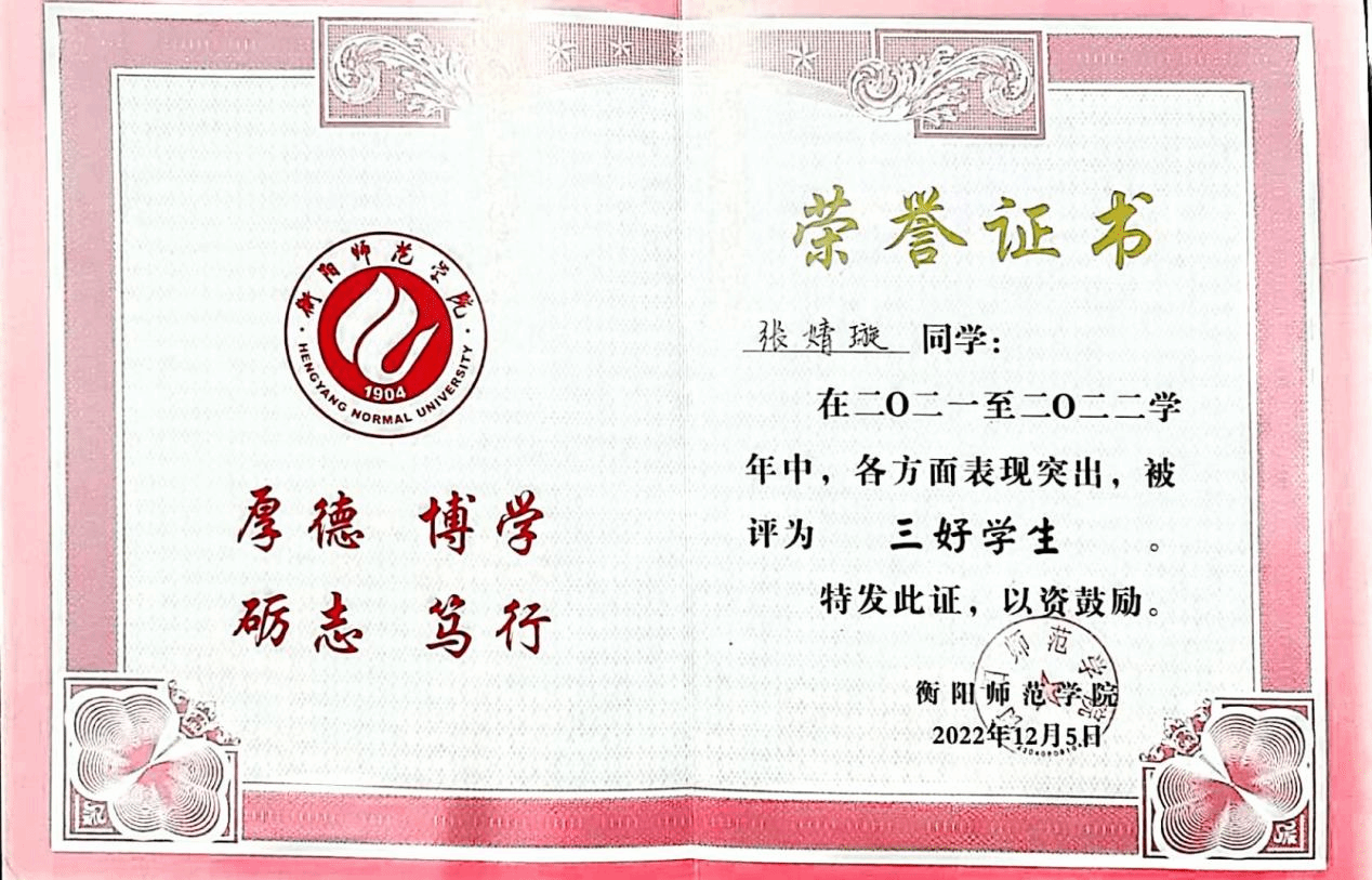 张婧璇同学连续两年荣获校级奖学金,被评为校级“三好学生”“优秀学生干部”,综合测评排名班级第一,学年成绩在本专业排名前3.125%,她顺利通过英语四、六级考试,已获得普通话二甲证书、计算机二级证书、高中语文教师资格证书等。