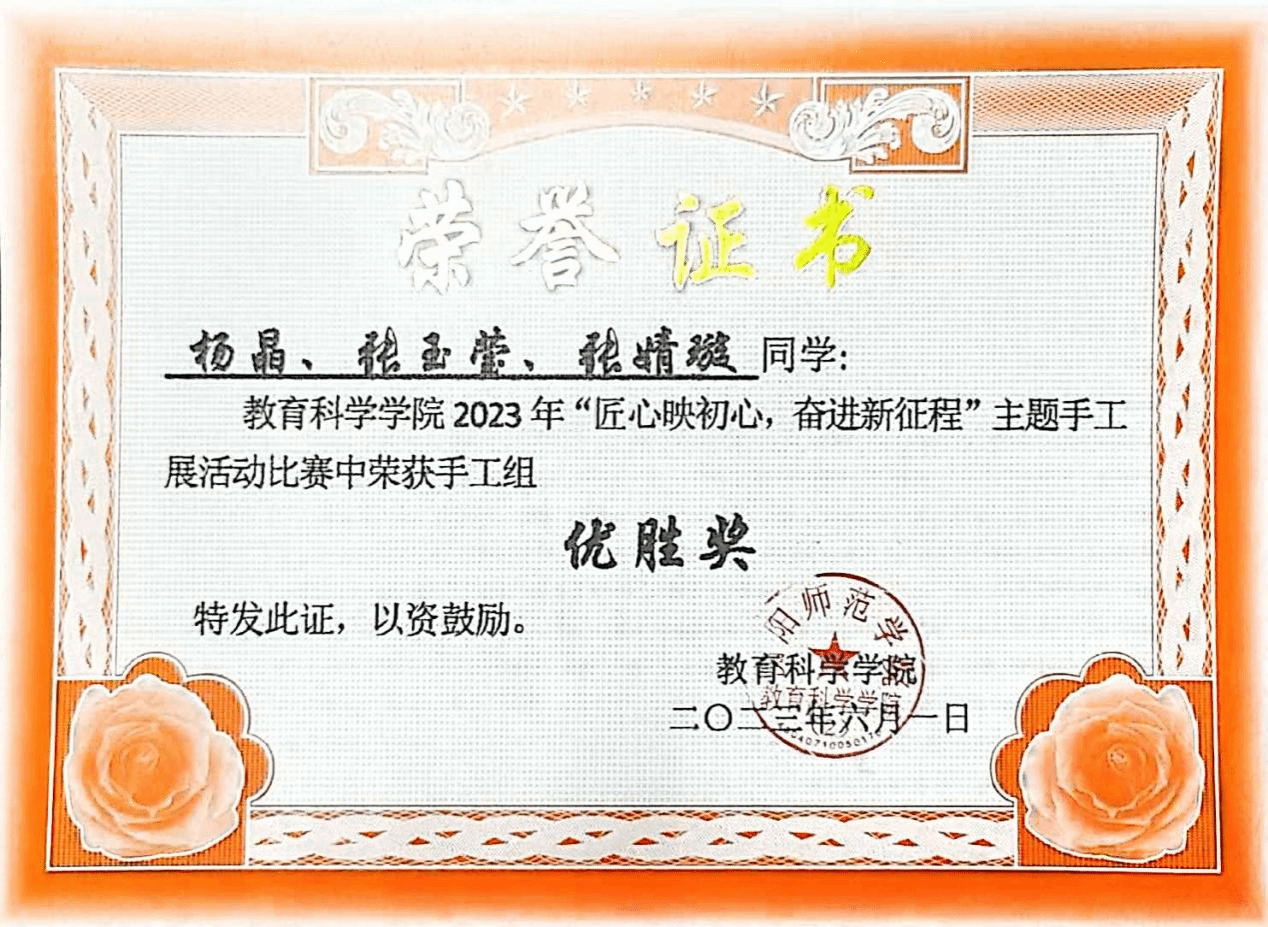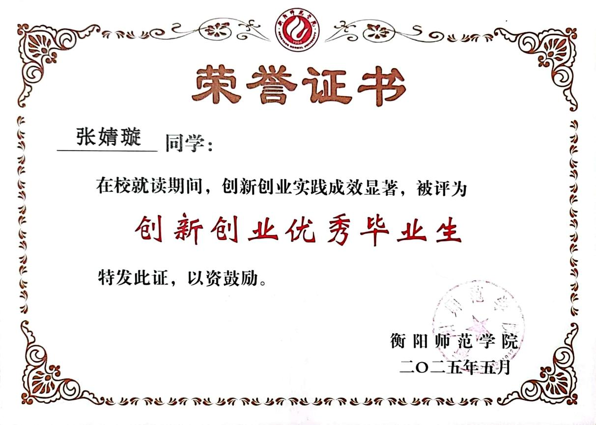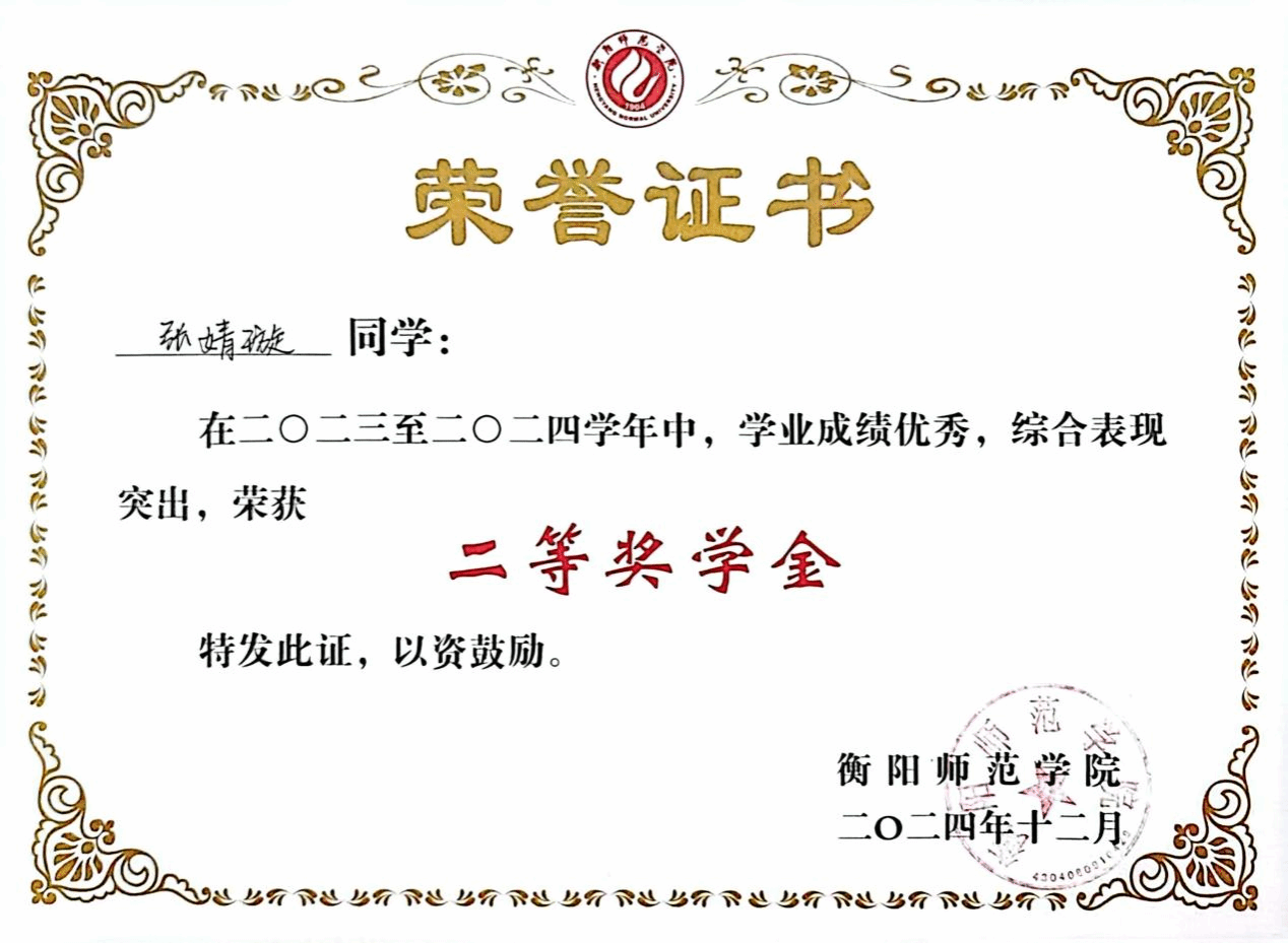 张婧璇同学连续两年荣获校级奖学金,被评为校级“三好学生”“优秀学生干部”,综合测评排名班级第一,学年成绩在本专业排名前3.125%,她顺利通过英语四、六级考试,已获得普通话二甲证书、计算机二级证书、高中语文教师资格证书等。