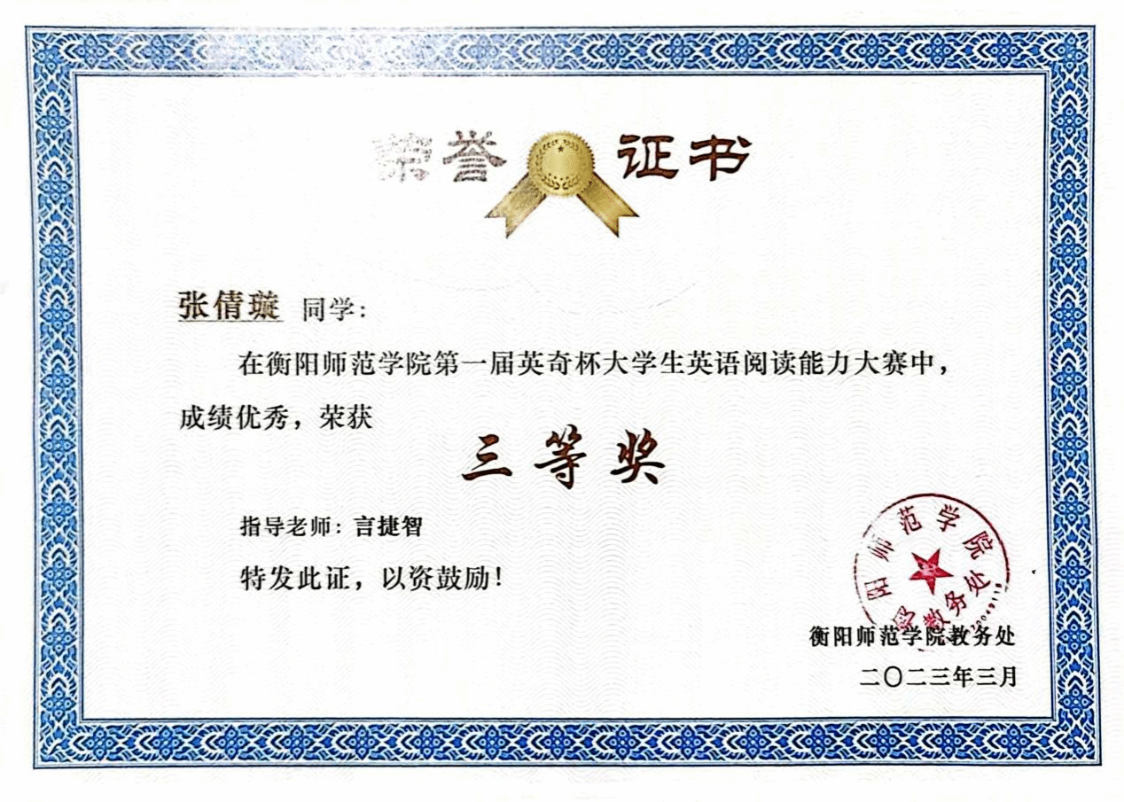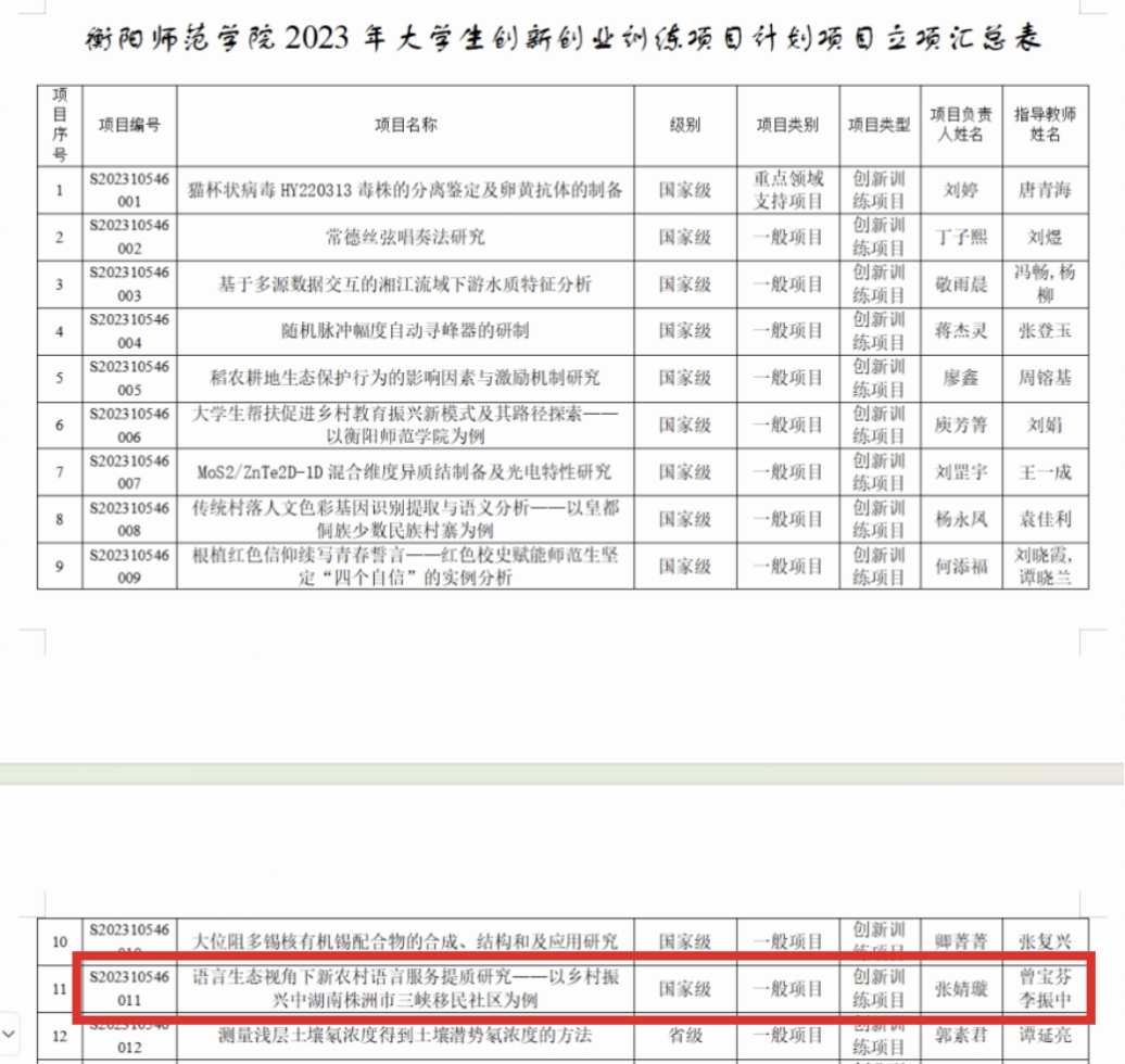 甘于坚守,潜心钻研。张婧璇正在主持国家级大学生创新创业大赛项目(项目编号为S202310546011),作为国家级项目负责人,注重提高科研素养,在课余时间积极与院校老师探讨科研项目选题,荣获衡阳师范学院第二十三届大学生课外学术科技作品大赛二等奖。所主持课题《语言生态视角下新农村语言服务提质研究——以乡村振兴中湖南株洲市三峡移民社区为例》获国家级和省级大学生创新创业训练计划立项,目前顺利结项,已发表省级期刊论文2篇。在这次国家级比赛中,张婧璇迎难而上,带领团队于2023年暑期前往湖南株洲实地调研,团队成员均不是本地人,对当地情况不了解,交通、住宿、餐饮等成为难题。在曾宝芬老师和李振中老师的指导下,张婧璇在调研前做好调研规划,在调研期间经常挑灯查找资料信息,协商并改善调研计划,并拨打市镇政府电话寻求帮助,最后与团队成员齐心协力,顺利去往株洲醴陵、攸县、渌口区等三峡移民地区。最终顺利完成调研任务,获得了第一手真实可靠的资料,为后续研究打下坚实基础。