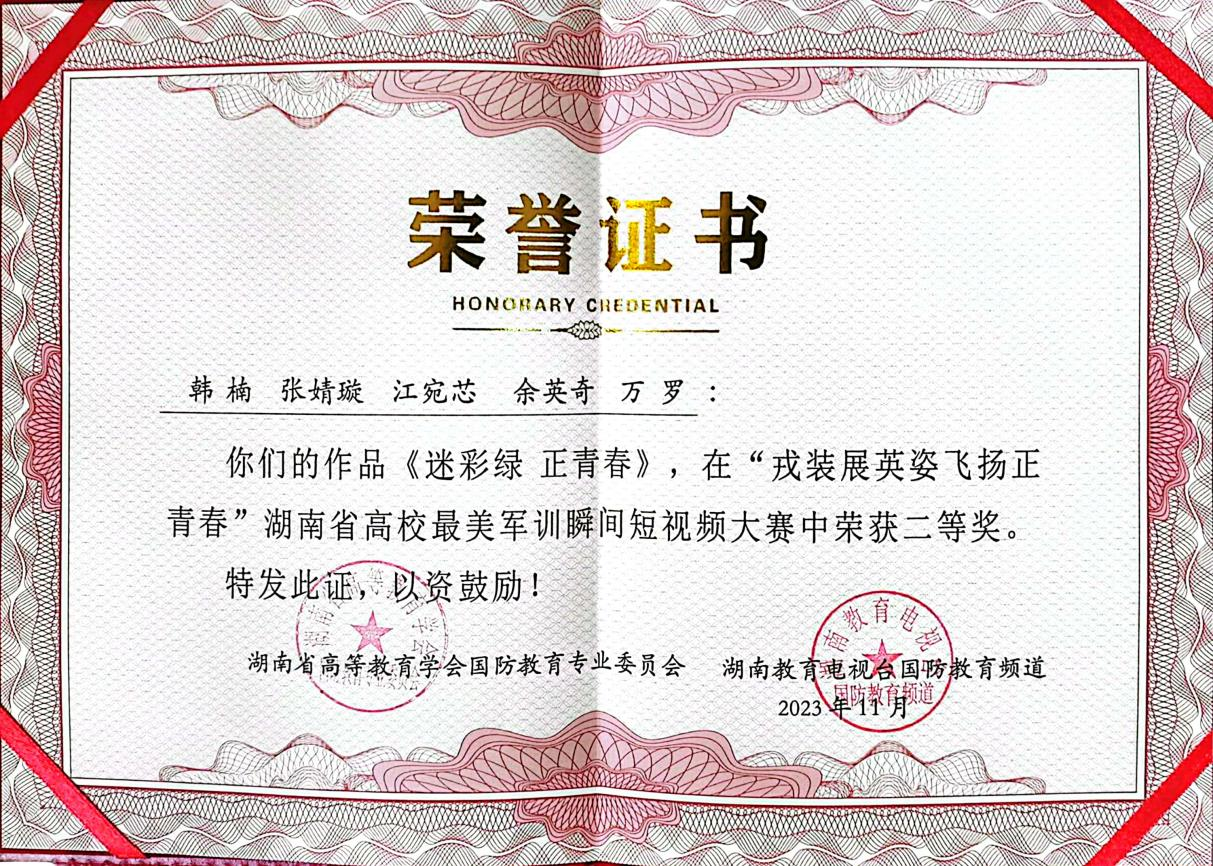 2023年获得湖南省高校最美军训瞬间短视频大赛二等奖