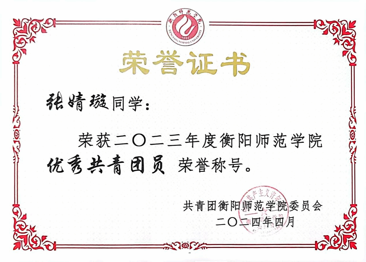 作为一名正式党员,张婧璇热爱和拥护中国共产党,立志听党话、跟党走,立志扎根人民、奉献国家。现任院学生第一党支部组织宣传委员,获校级“优秀共青团干部”“优秀共青团员”荣誉称号。锐意进取,不断前行。张婧璇积极向党组织靠拢,于2023年5月成为一名中国共产党预备党员。张婧璇坚持学习党的相关理论知识,定期进行思想汇报,一年后如期转正。张婧璇以身作则,主动承担党员的责任与担当,按时按质按量完成党组织交代的任务,积极开展谈心谈话工作。她始终以党员标准严格要求自己,发挥学生干部模范带头作用,在思想上坚定信仰、在行动上践行初心,成为坚定的青年马克思主义者。同时,张婧璇发挥先锋模范作用,带头学习最新时政要点,在迎新党员服务台中答疑解惑,引导新生融入大学生活,践行文学院“知行并进”理念,致力于将“全心全意为人民服务”付诸实践。张婧璇作风清正严明,严守纪律红线,永葆清廉底色,以“君子检身,常若有过”的自觉锤炼品格,在言行举止间彰显共产党人的浩然正气。