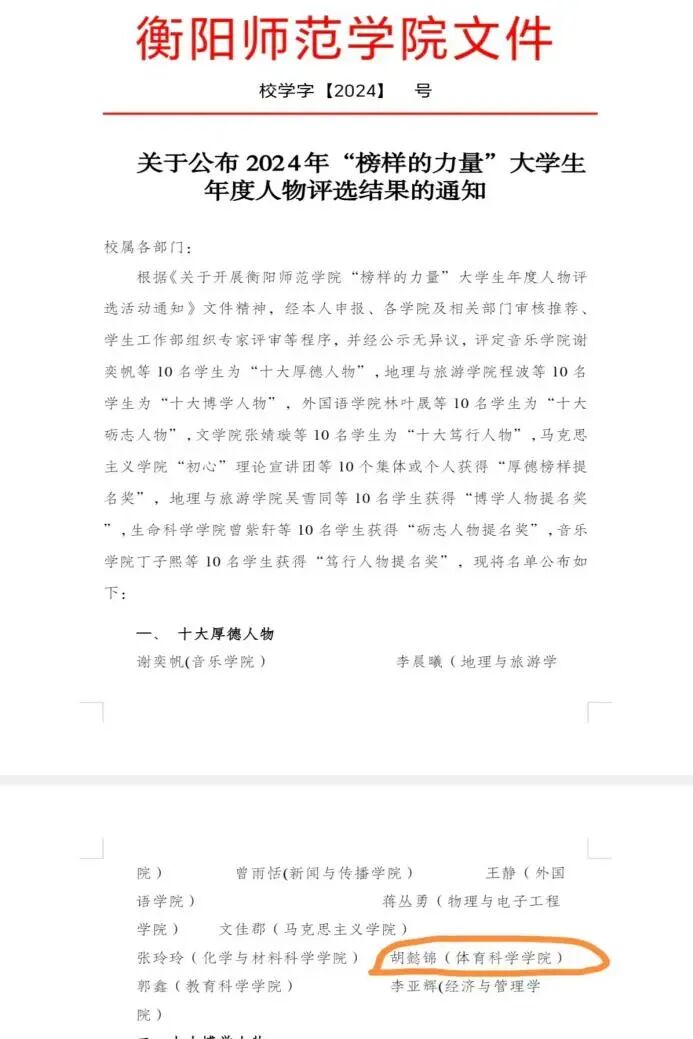 2024年获衡阳师范学院“榜样的力量”十大厚德人物