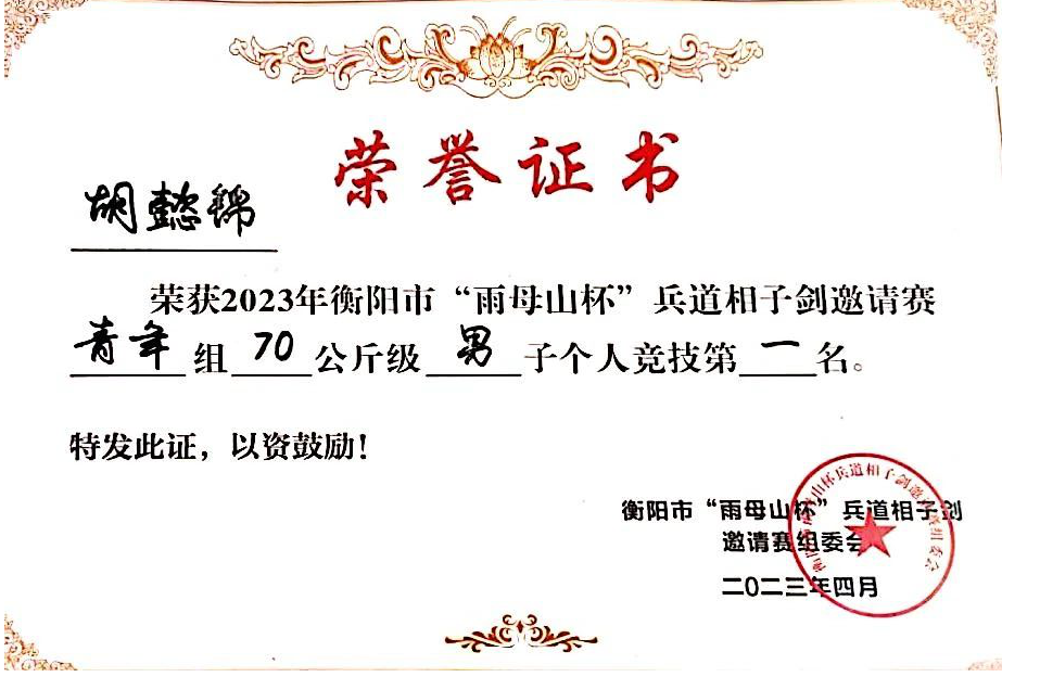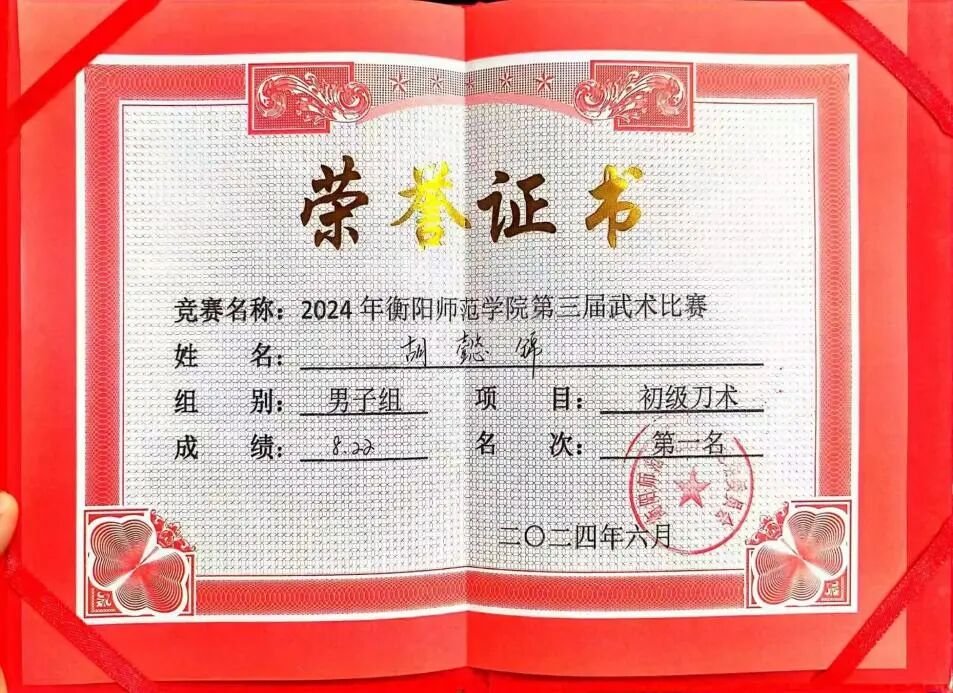 2024年获衡阳师范学院第三届武术比赛初级刀术项目男子组第一名