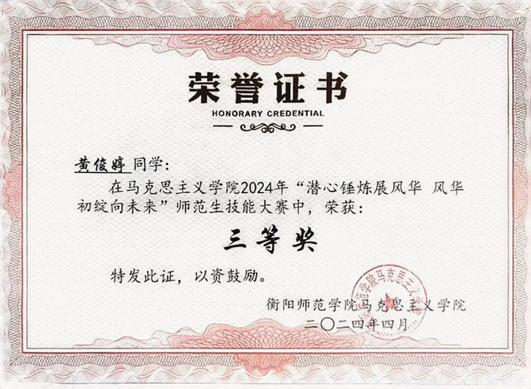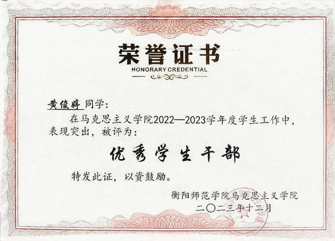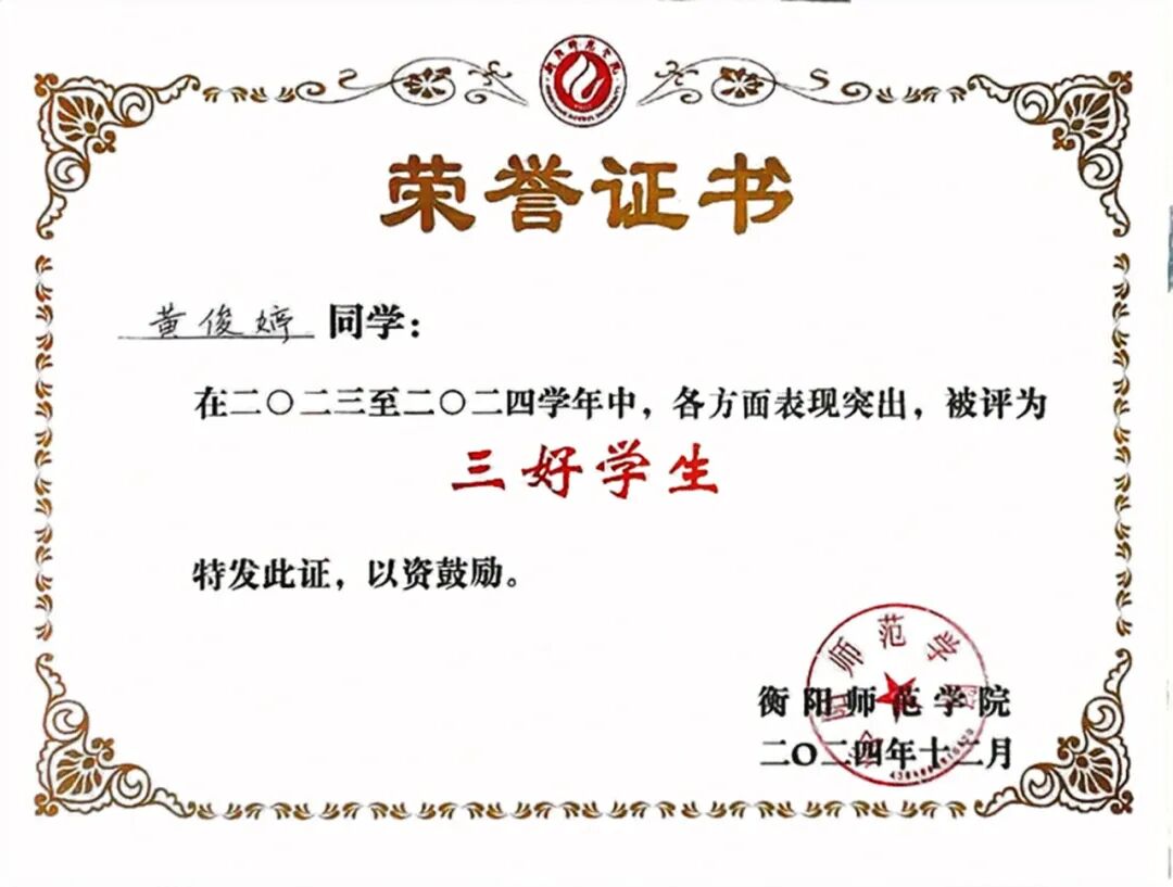 黄俊婷坚信知识能改变命运,用勤奋书写优异成绩;始终秉持奉献精神,以志愿服务传递温暖;坚持担当班级工作,为集体发光发热。她以实际行动告诉我们,困难是成长的养分,奋斗是青春的号角。身为衡师学子,我们应从她身上汲取力量,以平常心面对波折,以坚强意志跨越险阻,在学业和生活中奋勇向前,传承励志精神,为梦想拼搏,让青春在奋斗与奉献中熠熠生辉。