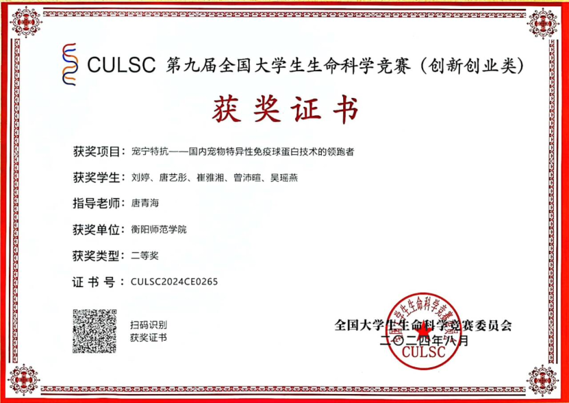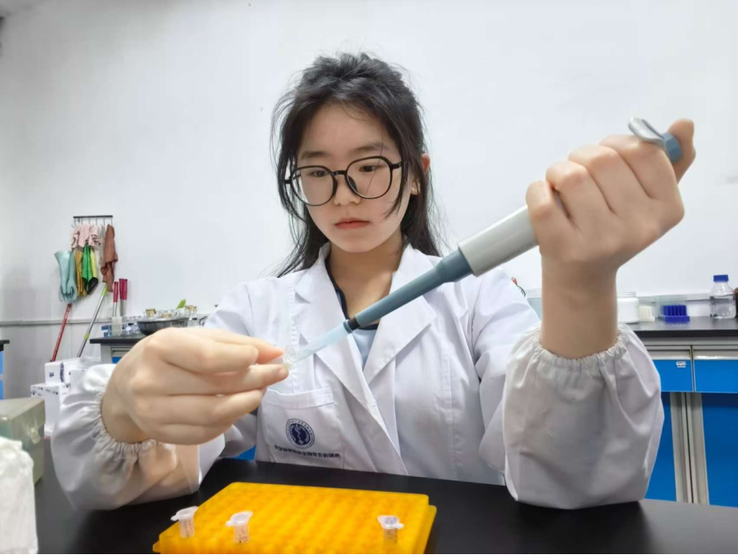 在专业技能竞赛中,曾沛暄凭借扎实的专业知识和创新思维,一路披荆斩棘。全国大学生生命科学竞赛探究类一等奖等 4 项国家级奖项、6 项省级奖项以及 7 项校级奖项,是她实力的见证。科研道路上,她同样勇攀高峰,参与申请 3 项发明专利,以第一发明人身份申请的《抗猪胆囊收缩素与生长抑素二联卵黄抗体及其制备方法》,更是彰显了她在生物药物研究领域的卓越能力。他们团队所建立的小分子抗体技术平台,不仅将卵黄抗体应用到了在畜禽、宠物领域,还将聚焦特种经济动物领域,为动物保健行业做出自己的贡献。
