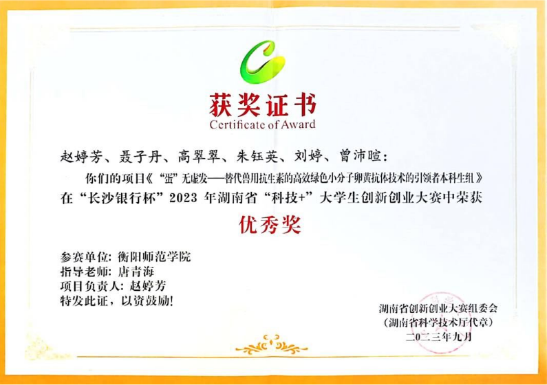 1.“长沙银行杯”2023年湖南省“科技+”大学生创新创业大赛优秀奖