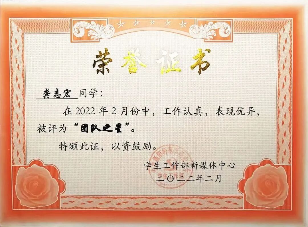 职位:现任化学与材料科学学院2304班班主任助理;曾任学生工作部新媒体中心副主编。2022级新生军训教官、雏鹰文学社写手部副部长、学工新媒体中心采编部副部长和技术部干事。