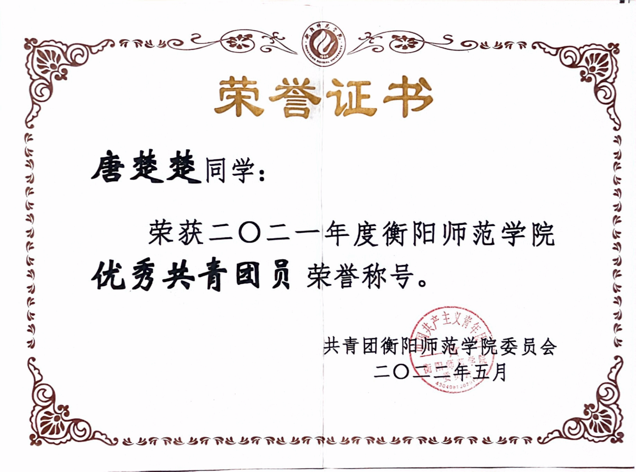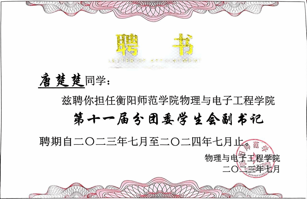 唐楚楚曾担任院团委副书记一职,自入学以来已担任学生干部4年,在职期间积极配合学院完成好各项工作,按时保质保量完成学院领导、老师下发的各项任务,同时认真开展团委建设工作,带领物电同学积极参与校园文体活动与志愿服务活动,主动帮助学院同学适应校园生活,为学院贡献积极力量。在职期间,唐楚楚同学组织举办了第十届团员代表大会暨学生代表大会、表彰大会等大型活动,负责撰写《2022年新生入学教育汇编》获“优秀组织奖”,相关论文投稿活动多篇获校级相关奖项。与此同时,唐楚楚连续两年年度学生干部评比为“优秀”,并获得校级“优秀团员”“优秀团员干部”称号。