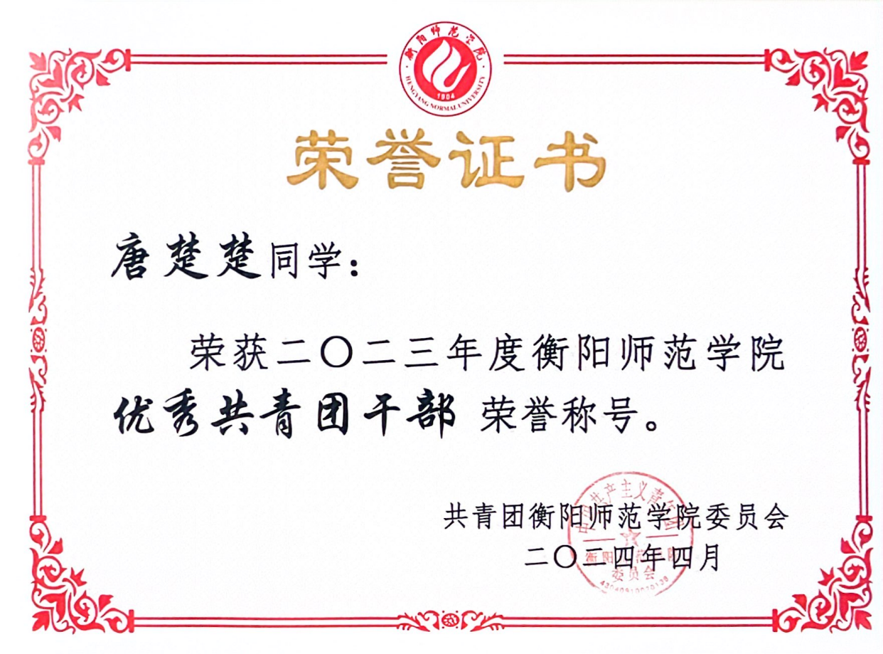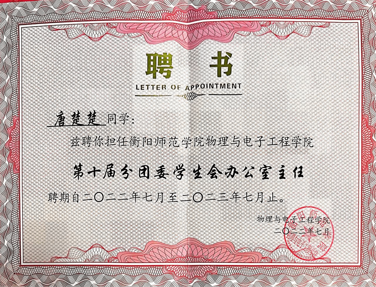2023-2024年度担任物理与电子工程学院分团委副书记、2022-2023年度任院团学办公室主任、2021-2022年度为团学办公室干事