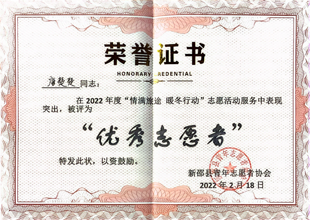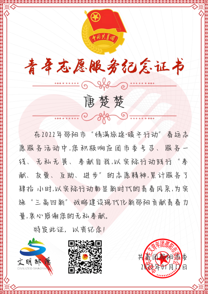 在疫情与春运同时来临的时候,唐楚楚积极参加了湖南省邵阳市新邵县“情满潇湘·暖冬行动”活动,经过志愿者培训与岗位分配,主动成为一名志愿者。在特殊时间为“归乡旅客”端茶送水,引导疏通乘客,帮助乘客快速通过行李安检,指引乘客到相应候车区候车,协助维持乘客验票次序。