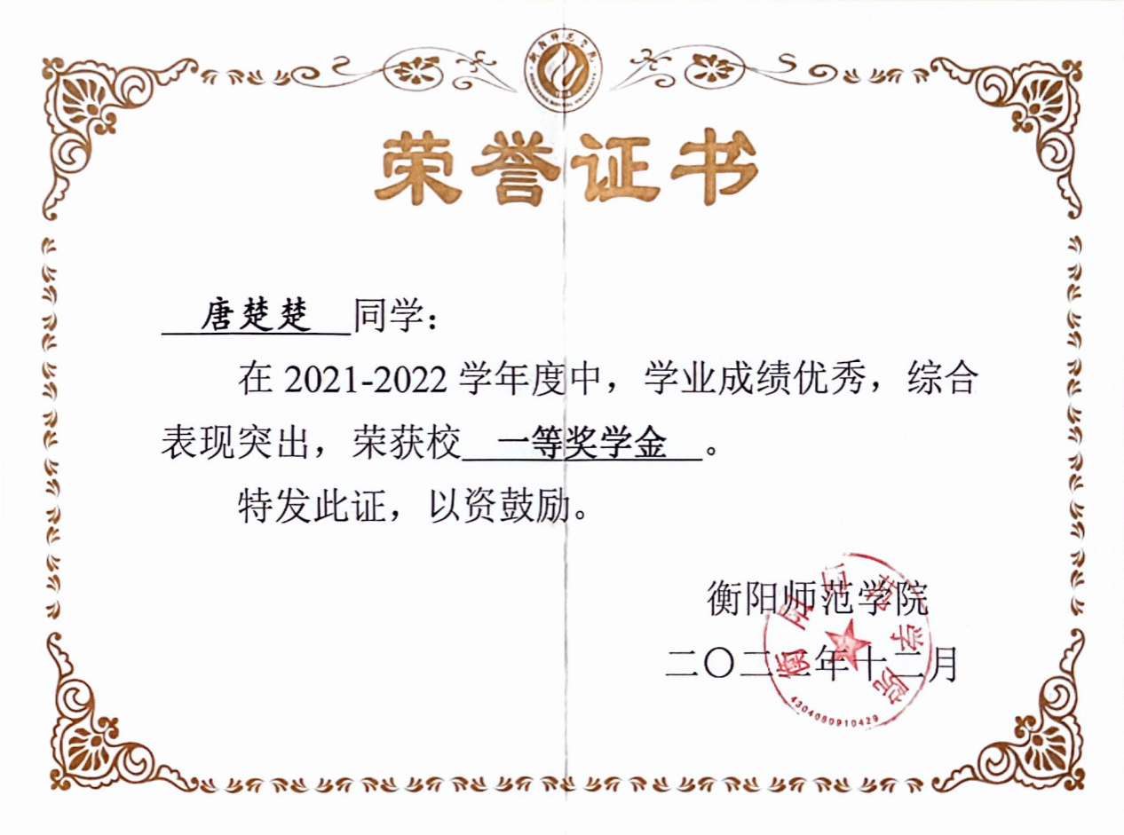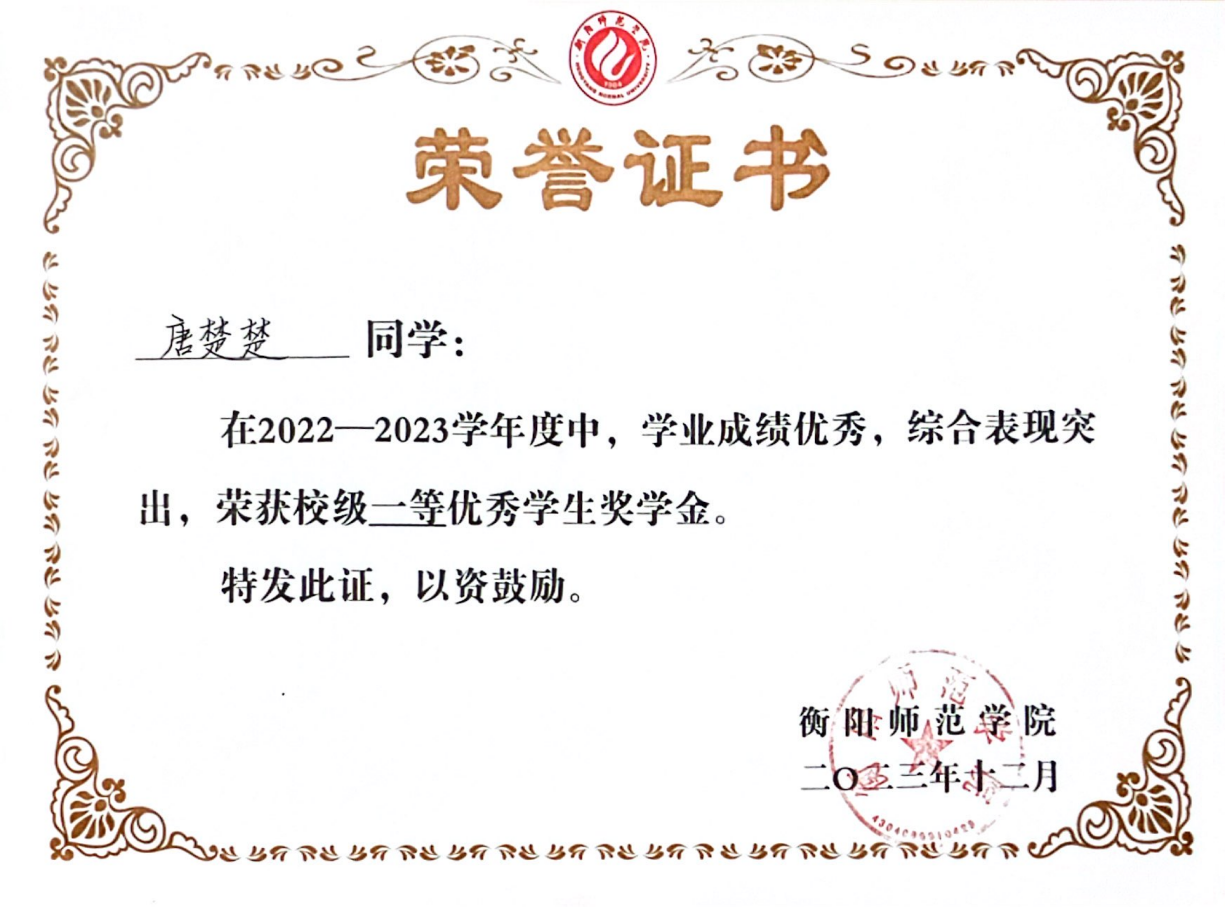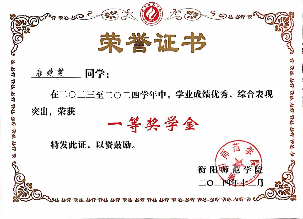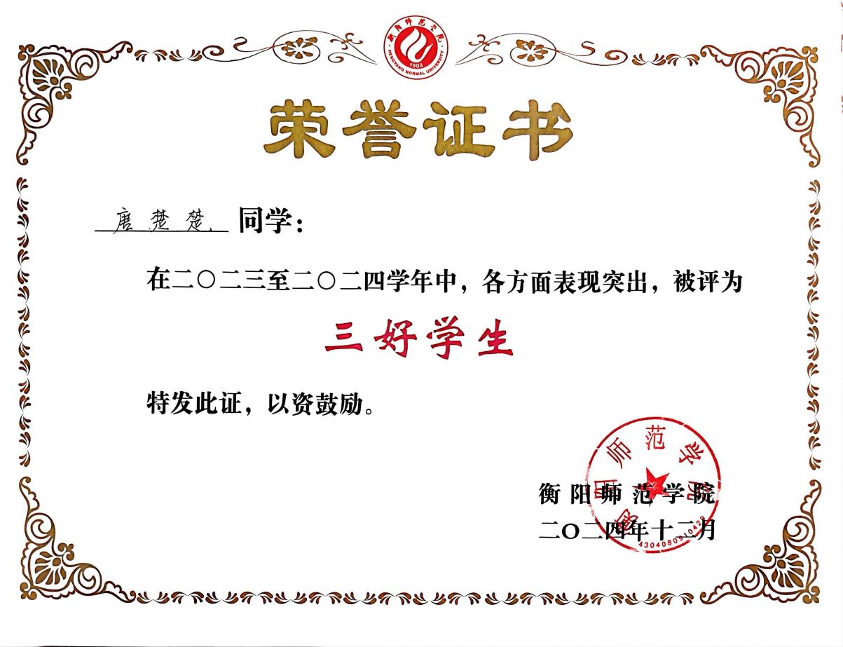 唐楚楚思想态度端正、锐意进取,热爱祖国与中国共产党,政治立场坚定。唐楚楚认为人生没有白走的路,每一步“笃行”都算数。她在大学期间认真学习了党的基本知识,并积极向党组织靠拢。在专业课的同时,唐楚楚也不忘努力提升自己其他方面的学习能力,考取了普通话二甲证书,英语四六级证书,教师资格证等,2021-2023年连续两年获“校一等奖学金”“校三好学生”荣誉奖励。与此同时,唐楚楚积极参与学科竞赛,在专业创新比赛方面有所成绩,于2023年荣获第九届全国大学生物理实验竞赛三等奖。