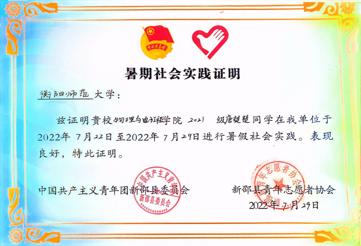 在2022年暑假期间,唐楚楚积极投身于“智慧潇湘·才聚新邵”返家乡大学生社会实践活动暨关爱留守儿童“七彩假期、益童成长”志愿服务活动,参观了新邵县经济开发区及雀塘镇产业园的湖南凯通电子有限公司、湖南科瑞生物制药股份有限公司、湖南启恒环保科技有限公司等,深入了解了家乡的发展及相关创业知识;同时,唐楚楚积极参与白水洞黄桃基地、助农廉政基地的学习,了解家乡特色农业,感受到了家乡变化之大。此外,唐楚楚积极参与关爱五保户活动,走访孤寡老人与困境家庭,了解相关政策,给他们送去温暖,深刻了解新社会新时代下乡村变化之大,家乡变化之大。