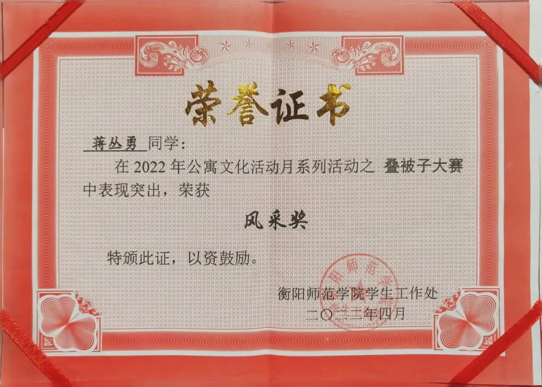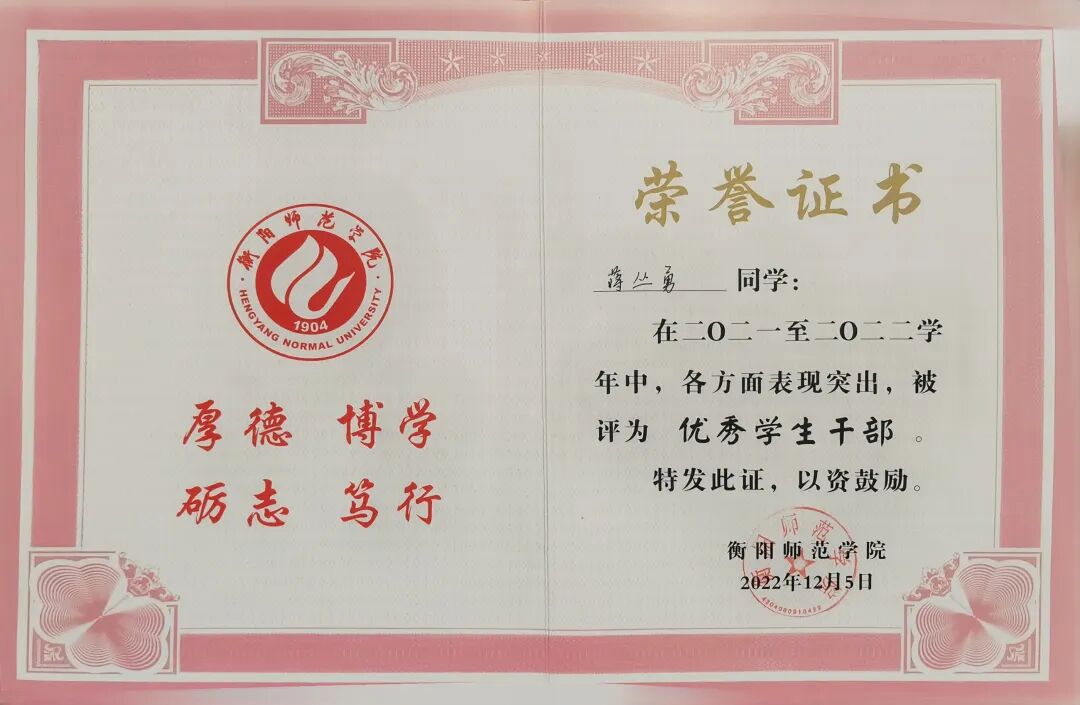 曾任干部经历:21级电子信息工程2班班长兼寝室长、雷锋家电工作室技术部助理、雷锋家电工作室技术部技术骨干、雷锋家电工作室副总经理、物理与电子工程学院学生第一党支部支部委员。