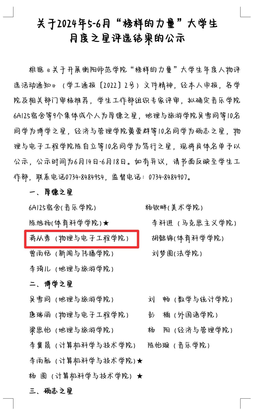 在物理与电子工程学院的青春画卷中,蒋丛勇以三重闪耀的身份,勾勒出新时代青年的责任与担当。作为雷锋家电工作室副总经理,他将大量时间投入工作室日常运营与技术钻研。与团队协同作业时,持续优化流程、积累经验。周末,他化身讲师,凭借丰富经验,以生动案例讲解维修理论,助力团队提升专业素养,推动工作室服务品质进阶;作为2021级电工2班班长,他精心策划每次班会,创新设计主题与互动环节,提升班会质量。同时主动搭建师生沟通桥梁,及时收集同学建议,准确传达教师要求;作为寝室长,他以细腻的关怀化身为温暖的“大家长”,与室友们齐心协力,打造温馨舒适的寝室生活环境。在他的统筹与引领下,寝室多次荣获“文明和谐示范寝室”的荣誉。2023年,在物理与电子工程学院举办的文明和谐宿舍文化活动中,一举摘得“最美寝室长”称号,成为老师与同学心中值得信赖的“主心骨”,用行动诠释责任与担当。