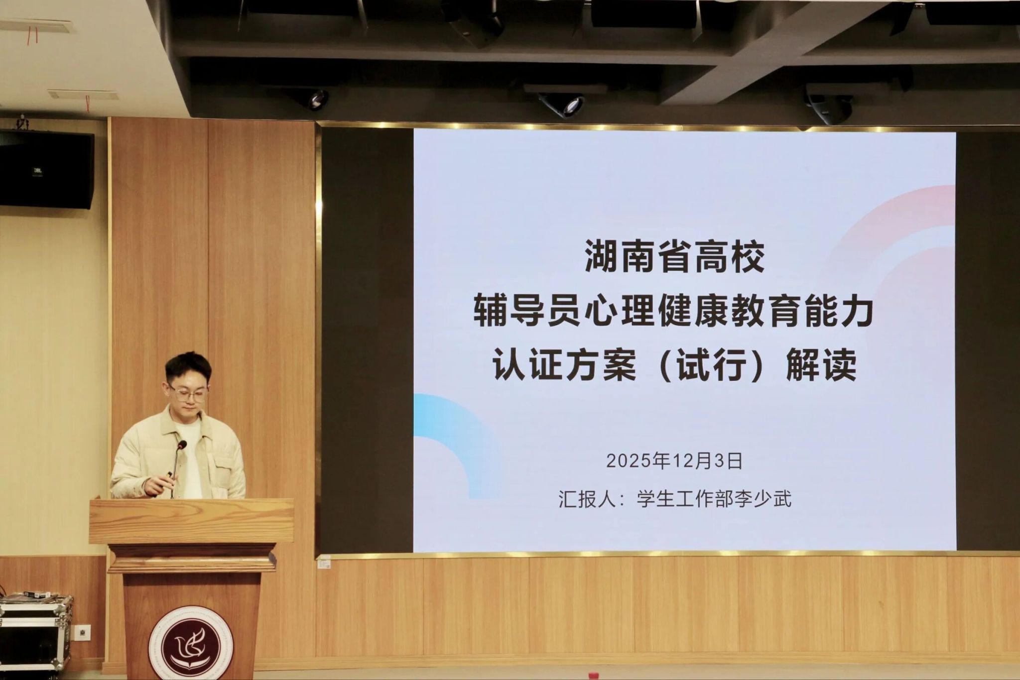 在学习会上,李少武重点围绕认证方案构建的“初级—中级—高级”三级体系进行了说明,详细介绍了该体系所包含的学分制管理与差异化目标。这一体系不仅为辅导员提供了清晰的专业成长路径,推动我校辅导员队伍建设迈向系统化与专业化,更体现出湖南省在推动全员心理健康教育工作走深走实上的坚定决心。心理健康教育是落实立德树人根本任务的重要环节,此次认证工作是提升辅导员队伍专业化水平的关键举措。学校将全力支持认证工作,确保每位辅导员都能通过系统学习与实践,掌握扎实的心理健康教育技能,切实守护学生心理健康成长。